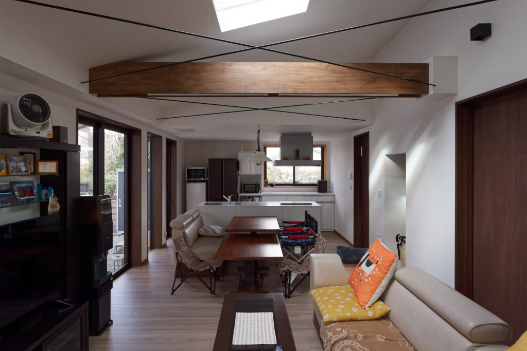 2階を撤去することにより、1階を勾配天井とすることができ、トップライトを設けることで、天井の低さや日当たりの悪さを解消している。断熱改修にも力を入れており、就寝前にエアコンは切るが、寒い朝でも18℃くらいはキープできているようである。