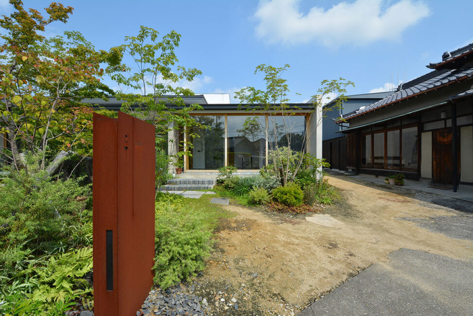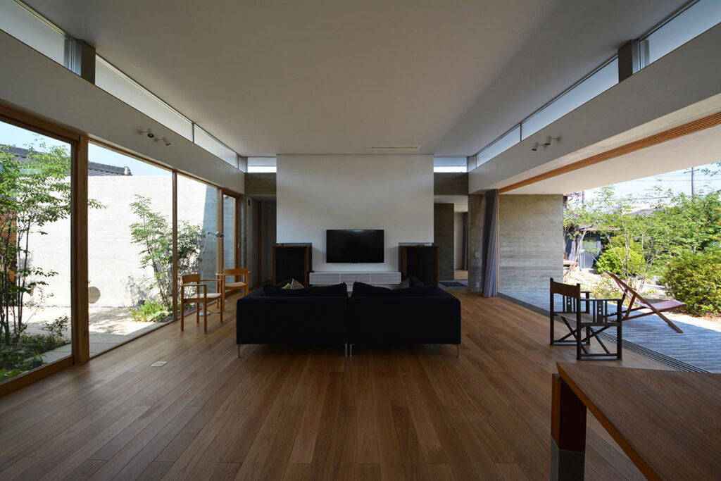 平面計画としてはそれぞれの空間が独立性を保っているが、間に庭を配置することでお互いに気配を感じることができる。玄関という特別な空間はなく、テラスからつながるタイルの床が動線の目印となっている。