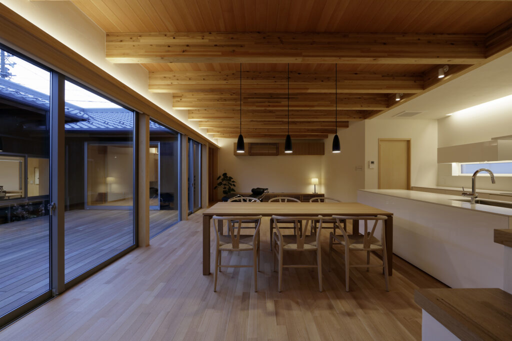 住まいは共働きと職住近接を考慮してキッチンを中心にした最短距離での家事動線となるように計画した。木デッキの住居用中庭と床石と敷瓦による事務所庭を設置して、プライバシーの確保とともに2種類の庭を楽しむ贅沢な空間となった。中庭を設けることでリビングダイニングや子供室などの各部屋に光と風を呼び込み、快適な住まいとした。